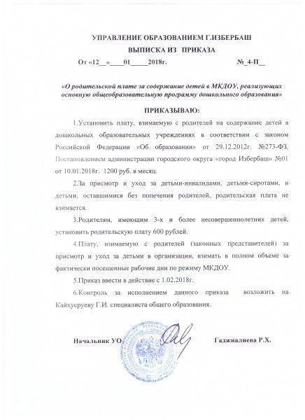 Документ об установлении размера платы, взимаемой с родителей (законных представителей)
